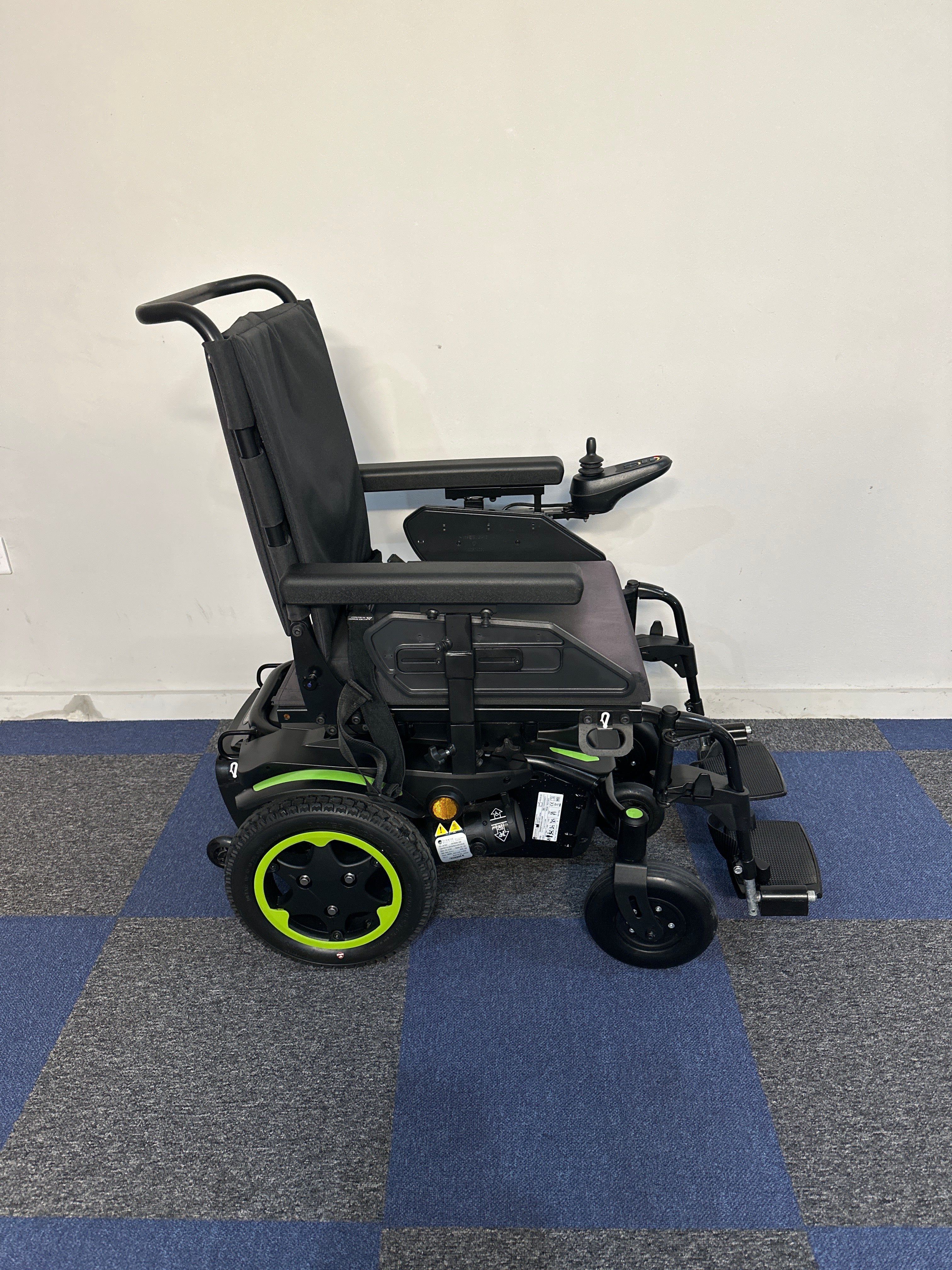 This Quantum Q100 R powerchair has been fully inspected and tested to ensure it is in excellent working condition. While it is a used model, it has been well-maintained and cared for, and is in excellent condition. The front of the seat cushion cover has slight fading on the edge.